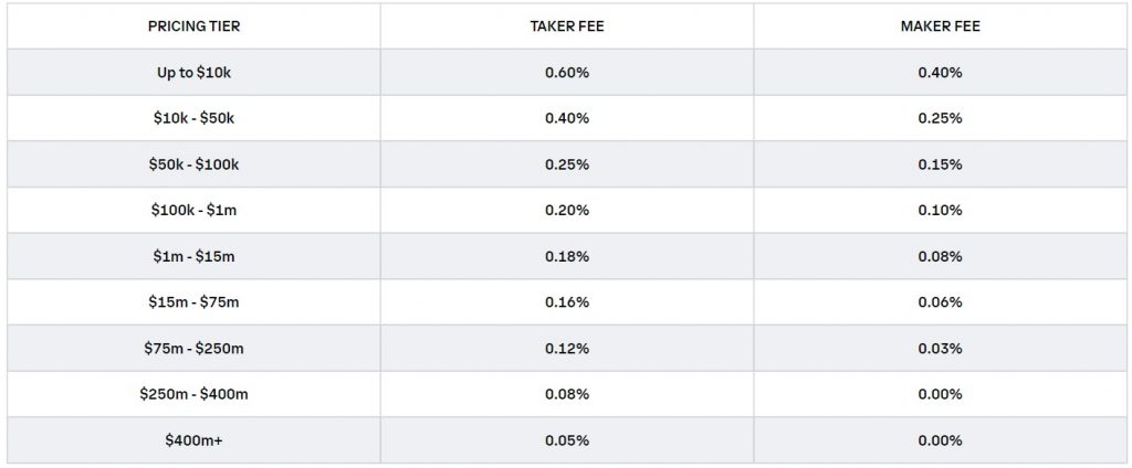 Prowizje na Coinbase Pro zależą od 30-dniowego wolumenu transakcji. Dla początkującego inwestora, operującego niewielkimi kwotami Maker wynosi 0,4% a Taker 0,6%.