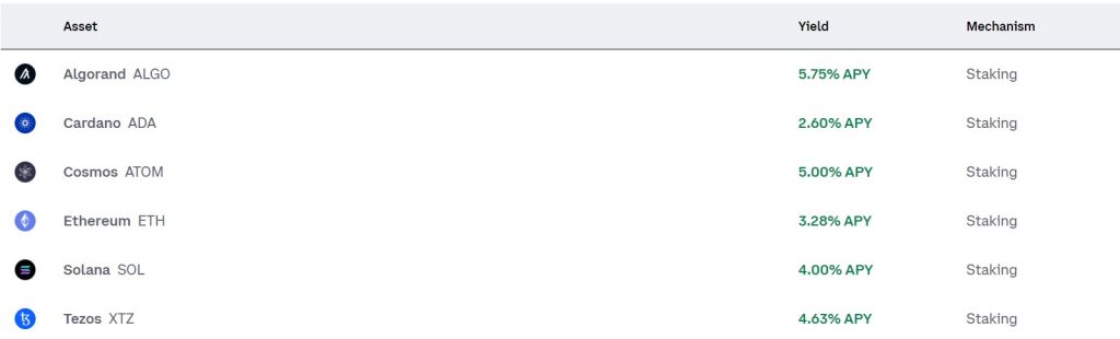W momencie tworzenia tej recenzji Coinbase umożliwia stakowanie 6 kryptowalut: ETH, ADA, ALGO, ATOM, SOL, XTZ.