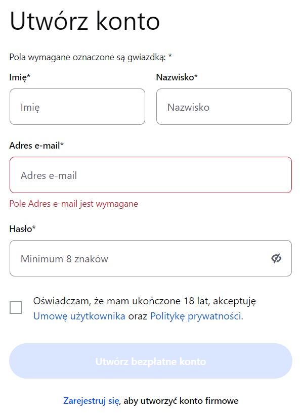 2. W następnym kroku uzupełnij swoje imię, nazwisko oraz wymyśl hasło do konta.