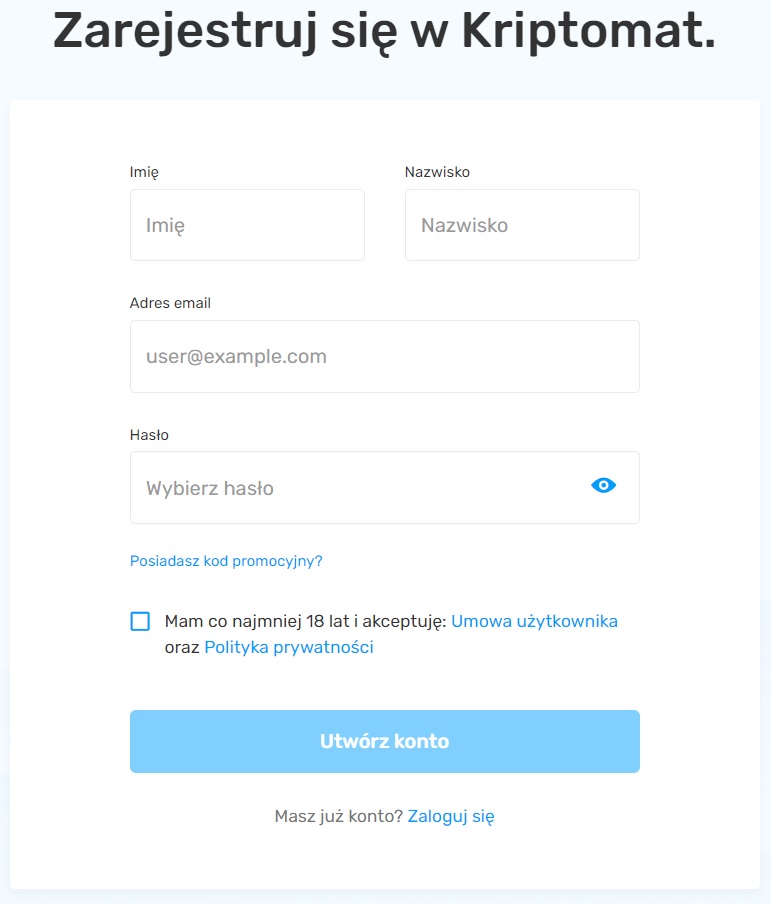 1. Wejdź na stronę giełdy Kriptomat i zarejestruj się. Wpisz swoje imię, nazwisko, adres mailowy oraz ustal silne hasło.