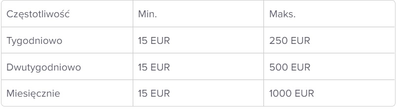 Chciałbyś oszczędzać w krypto na emeryturę? Z Kriptomat to proste. Możesz ustalić zakupy cykliczne, czyli automatyczne zakupy w określonych odstępach czasu (co tydzień, dwa tygodnie lub co miesiąc). Kryptowaluty kupujesz z salda FIAT lub bezpośrednio z karty kredytowej. Obowiązują określone limity na transakcję: