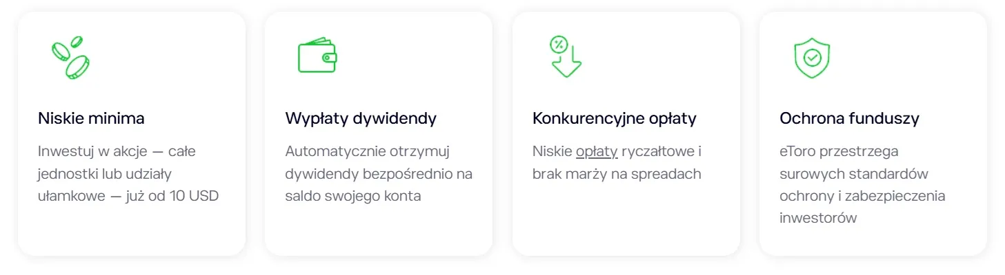 Dla klientów z Polski prowizja za otwarcie lub zamknięcie pozycji na akcjach to 1$, lub 2$, w zależności od giełdy. Opłaty są zawsze naliczane w dolarach. Nie są stosowane przy copytradingu, w inteligentnych portfelach oraz przy otwieraniu planów cyklicznych.