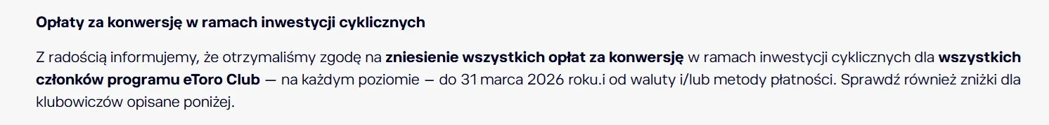 Uwaga: do końca marca 2026 roku obowiązuje promocja, dzięki której inwestycje cykliczne są zwolnione z opłaty za przewalutowanie, o ile jesteś członkiem eToro Club.