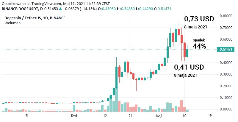 A to rzeczony spadek z dnia na dzień. 8 maja 2021 Doge miał swoje dotychczasowe ATH, a 9 maja był już o ponad 40% tańszy.