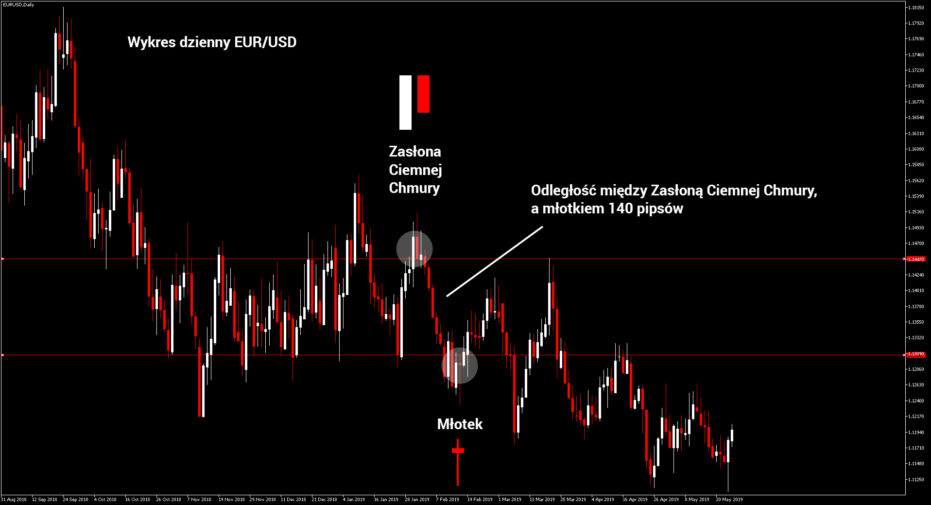 Pozycję gry na spadki otworzymy na interwale dziennym wykresu Euro do dolara amerykańskiego. Przykładowa transakcja została otwarta po dostrzeżeniu przez tradera formacji Zasłony Ciemnej Chmury (opisałem w przykładzie powyżej). Do zakończenia gry doszło po wyrysowaniu się formacji przeciwstawnej, w tym przypadku Młotka (świeca o małym korpusie i długim cieniu). Transakcja trwała 10 dni, czyli 2 tygodnie. Podobnie jak surowce, rynki Forex są otwarte tylko w dni robocze. W tym czasie cena przemierzyła odległość 140 pipsów.
