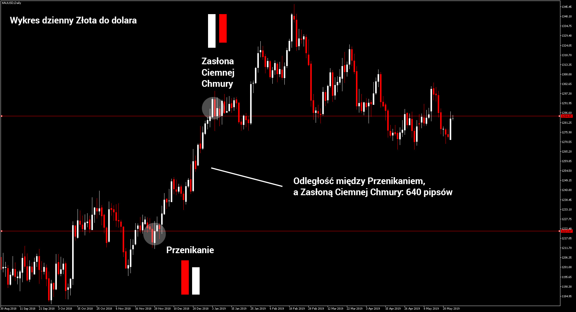 Poniższy wykres przedstawia rynek złota do dolara amerykańskiego na interwale dziennym. To jest aktualna sytuacja na rynku złota. Przykładowa transakcja mogłaby być w miejscu, w którym inwestor dostrzegł formację Przenikania, kiedy po świeczce spadkowej, wyrysuje się świeczka wzrostowa, jednak jej korpus jest mniejszy niż wcześniejszej świeczki. Transakcję trzymamy otwartą aż do wyrysowania się formacji Zasłony Ciemnej Chmury. Mamy do czynienia z tą formacją, kiedy po świeczce wzrostowej wyrysuje się świeczka spadkowa, jednak jej korpus nie jest tak duży, aby przykryć wysokość korpusu świecy wzrostowej. Potencjalna transakcja trwałaby 22 dni robocze, czyli cały miesiąc. Rynki surowców otwarte są tylko w dni robocze. Cena w tym czasie przemierzyłaby odległość 640 pipsów.